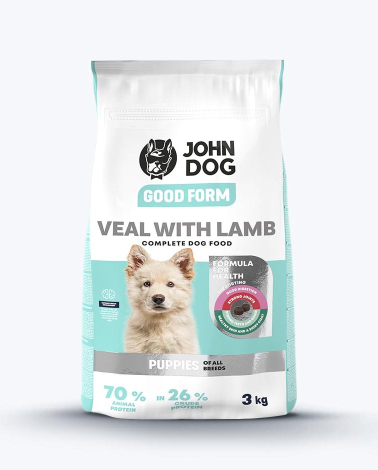 Receptura stworzona dla szczeniaka na bazie dwóch rodzajów mięs – cielęciny i jagnięciny. Karmę wzbogacono o składniki, dzięki którym cała kompozycja spełnia określone funkcje. Skórę i lśniącą sierść wspiera olej z łososia. Drożdże piwne stymulują trawienie, a suszona cykoria, która jest źródłem inuliny, czyli naturalnego prebiotyku, optymalizuje florę bakteryjną jelit. Rozwój stawów u szczeniąt polepsza glukozamina i chondroityna. Dodatek w postaci witaminy D3 zapewnia lepsze wchłanianie wapnia, a co za tym idzie wspiera rozwój zębów i kości. Co najważniejsze, zawarte w karmie John Dog Good Form veal with lamb puppy kwasy tłuszczowe omega-3, wpływają pozytywnie na mózg i zdolności uczenia się szczeniąt.